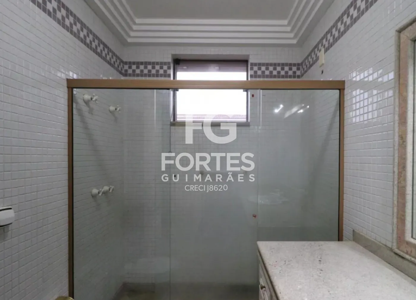 - Banheiros com gabinete de pia, espelho, box de vidro e chuveiro