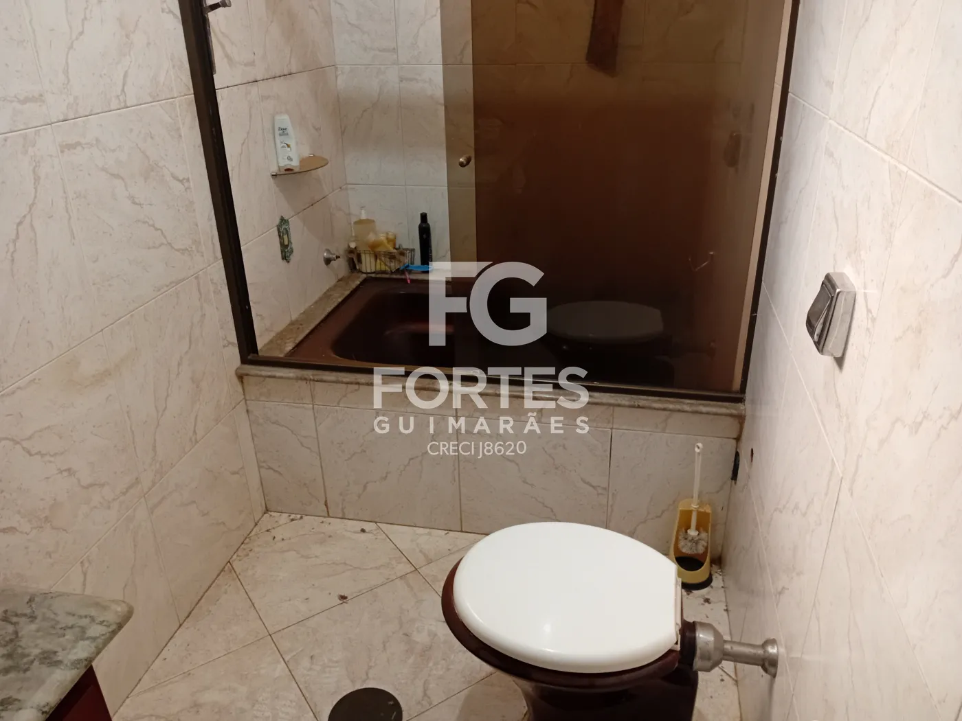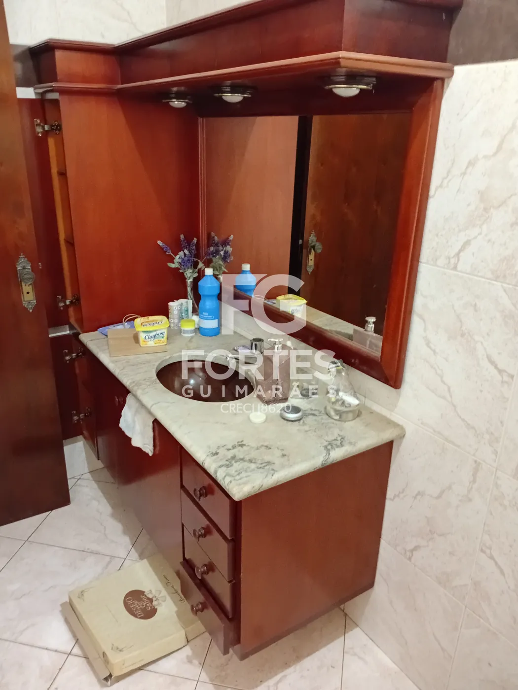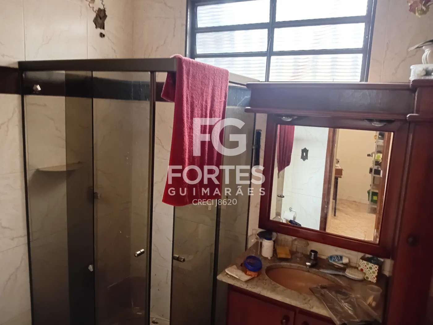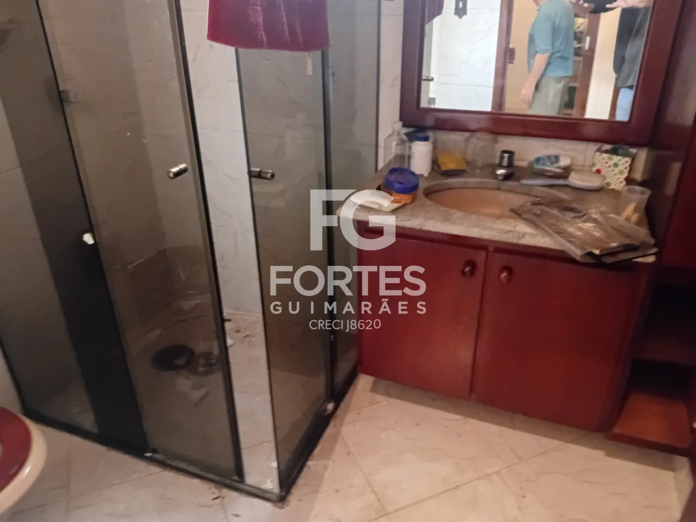 - Banheiro social com box de vidro, gabinete de pia e espelho