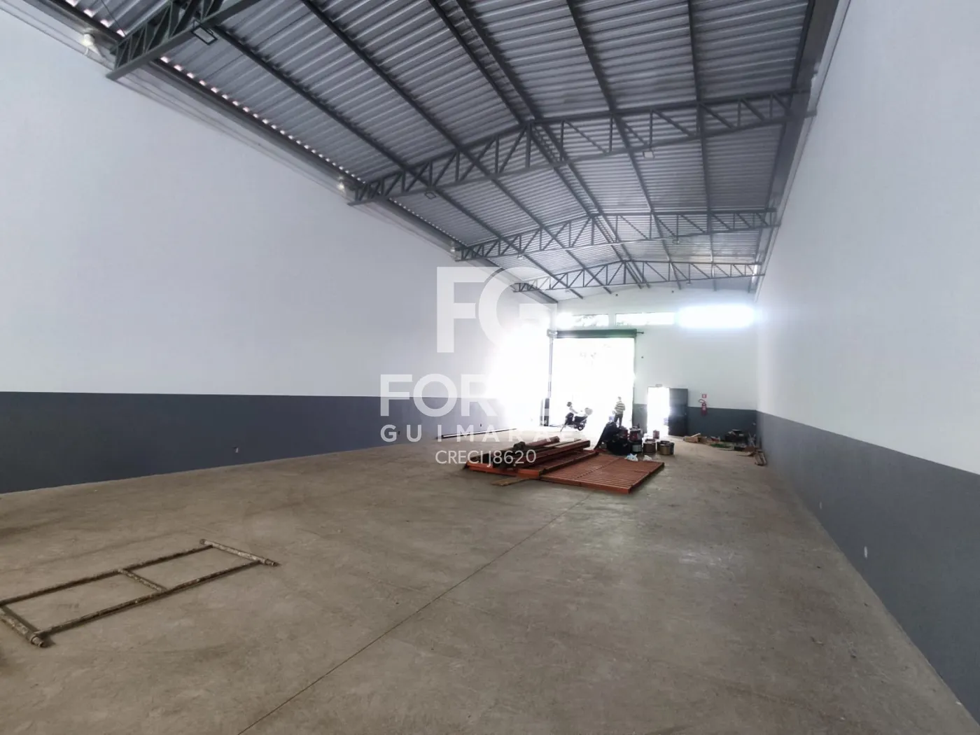 Excelente salão comercial, são 340 m² de área construída, pé direito de 6 metros, vão livre, 02 banheiros, copa, área externa nos fundos, recuo frontal com 04 vagas de estacionamento, porta de aço automática, piso em concreto usinado e cobertura em estrutura metálica.