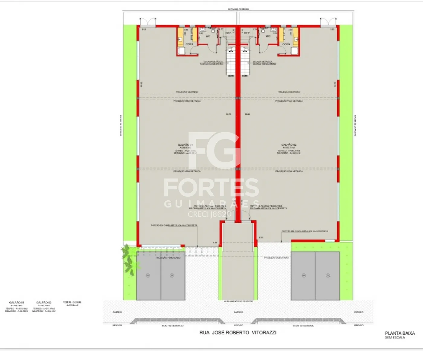 Salão com pé direito duplo 295,5 m² AC sendo 184m² pavimento térreo (salão) + 111,5m² pavimento superior (mezanino), ao lado da avenida Cel Fernando Ferreira Leite, 02 wc, espaço copa e recuo frontal com 04 vagas de garagens. Imóvel novo.